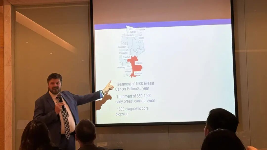 杨亚龙博士毕业于德国尤斯图斯-李比希-吉森大学,他在报告中系统介绍了湖北省肿瘤医院乳腺中心作为全省唯一乳腺疾病诊疗中心的建设情况,重点分享了该中心近年来在临床业务规模、基础科学研究和临床转化研究方面的进展与特色。中心展现的综合实力与科研积累引起了德方专家的浓厚兴趣,也成为Peter A. Fasching教授此次访华寻求合作的重要动因之一。