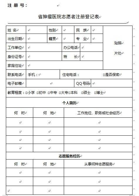 (四)申请人直接到医院志愿者服务团队提出申请,填写《省肿瘤医院志愿者注册登记表》。