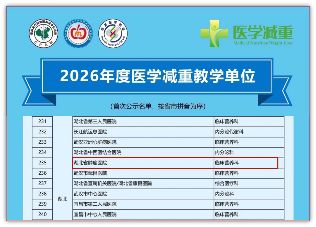 近日,中国医疗保健国际交流促进会临床营养健康学分会正式公布“2026年度医学减重教学单位”名单,湖北省肿瘤医院临床营养科凭借持续的诊疗优化、专业团队建设与扎实的临床成效,顺利通过评审,再度成功入选。