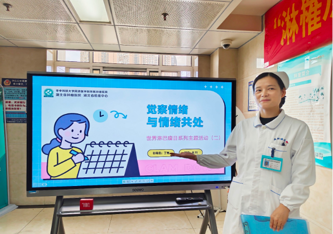 活动伊始,心理专科护士丁秀为大家带来了以 “觉察情绪,与情绪共处” 为主题的团体心理辅导。丁秀护士从淋巴瘤患者常见的心理反应入手,用通俗易懂的语言和生动的案例,讲解了如何识别和正视确诊后的焦虑、恐惧、压力等负面情绪,并传授了情绪调节工具箱中的多种实用的情绪管理技巧,如“5-4-3-2-1 grounding(感官着陆)”等。她强调,情绪本身不是敌人,学会与情绪和平共处,是获得内心疗愈与力量的重要一步。这场活动如同一场“心理按摩”,为患者和家属们提供了至关重要的心理支持与疏导。