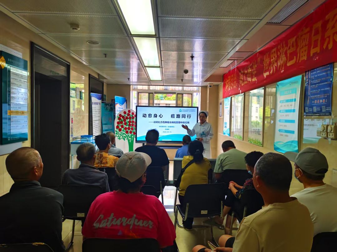 淋巴瘤内科护士长王娅妮首先开展了以“动愈身心,癌路同行——运动处方在肿瘤全病程管理中的应用”为主题的健康讲座。她从运动强度、频率和方式等方面入手,结合患者治疗期间的身体特点,推荐了如散步、太极、八段锦等低至中等强度的有氧运动,并强调量力而行、循序渐进的原则。王娅妮还提醒大家,适当运动不仅有助于减轻治疗带来的疲劳感,还能改善情绪、增强免疫力,为康复之路注入更多活力。此次活动提升了患者对“运动即良医”的认知,体现了我科践行“以患者为中心”全病程管理和“健康中国”战略的积极行动。
